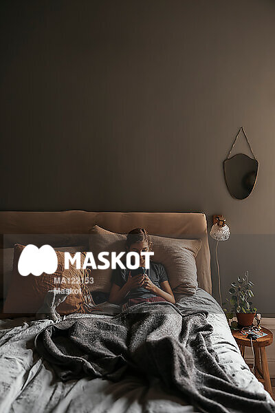 Ung flicka kollar på mobil i säng