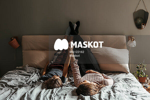 Mamma och dotter håller hand i säng