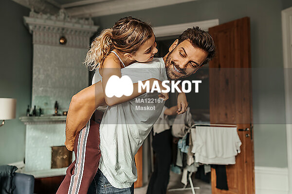 Pappa bär dotter på rygg i vardagsrum