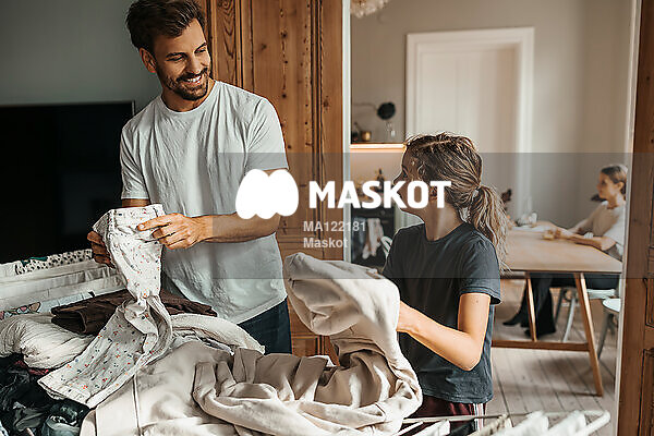 Leende pappa viker tvätt med dotter
