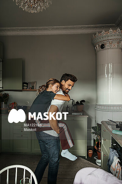 Ung flicka rider på pappas rygg i kök