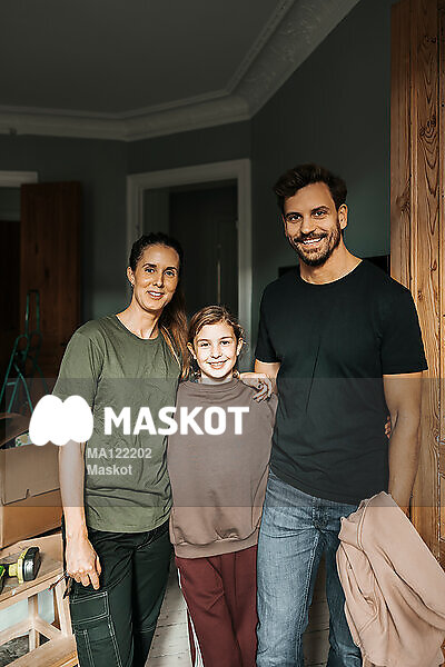 Porträtt av lglad familj som står i lägenhet