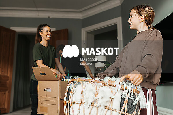 Leende ung flicka bär korg med filtar