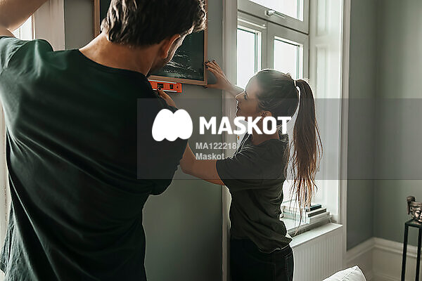 Man och kvinna jämnar ut bildram i lägenhet