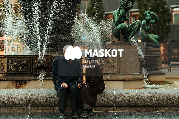 Äldre man och kvinna sitter vid fontän