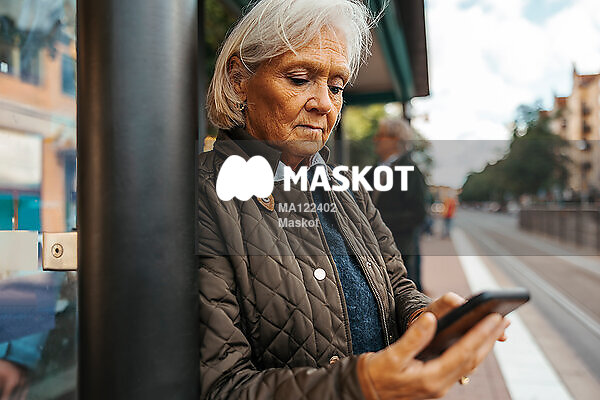 Äldre kvinna använder mobil vid busshållsplats