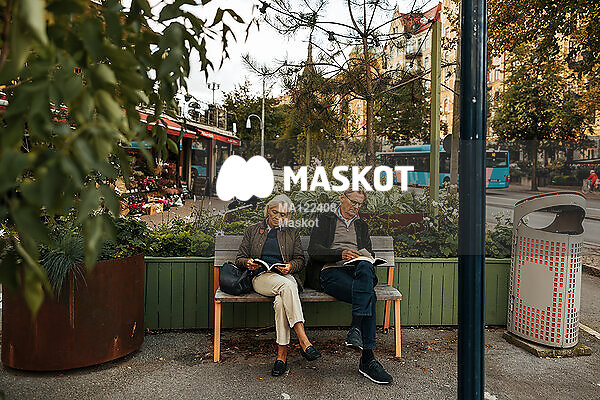 Äldre man och kvinna läser på parkbänk