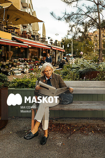 Äldre kvinna läser tidning på bänk