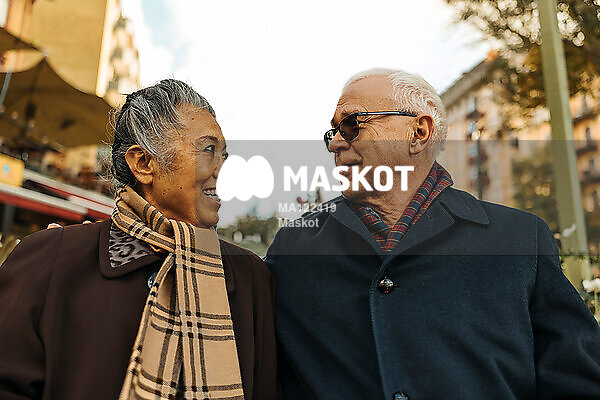 Äldre par umgås i stad