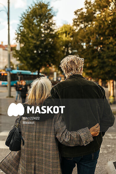 Äldre par går omfamnandes i stan