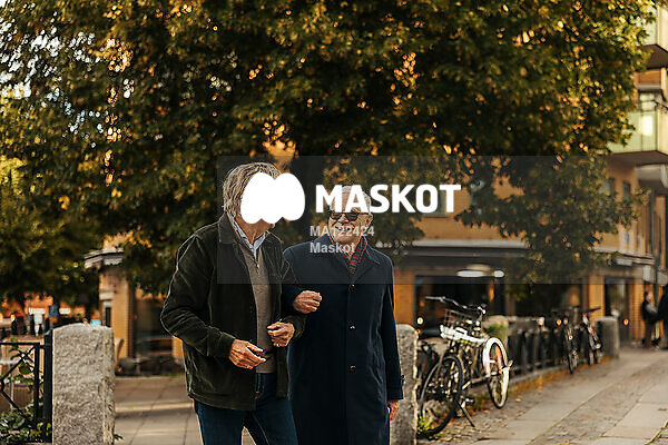 Äldre män går i armkrok i stad