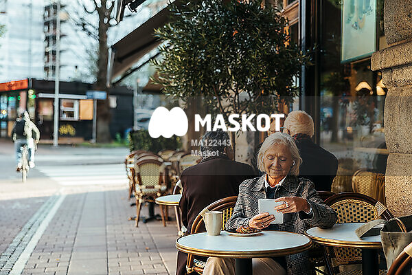 Leende äldre kvinna använder surfplatta på café