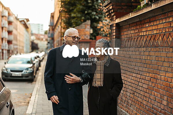 Leende äldre par går i stad