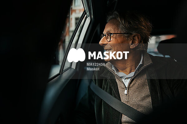 Leende äldre man kollar ut genom fönster på bil