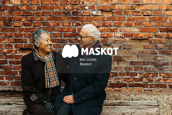 Glatt äldre par sitter på bänk framför tegelvägg
