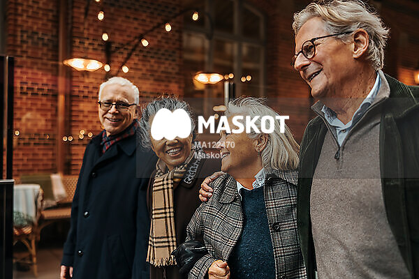 Glada äldre par går i stad