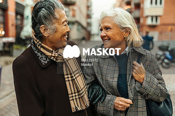 Glada äldre kvinnor går i stad