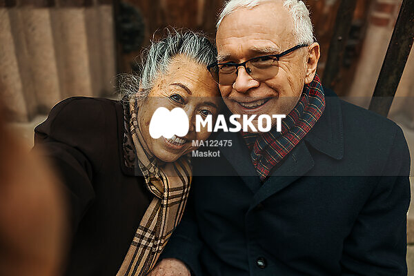 Porträtt av leende äldre man och kvinna som tar selfie