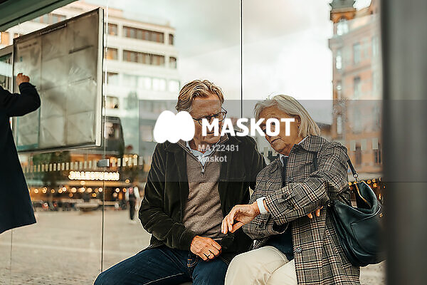 Äldre par väntar på buss