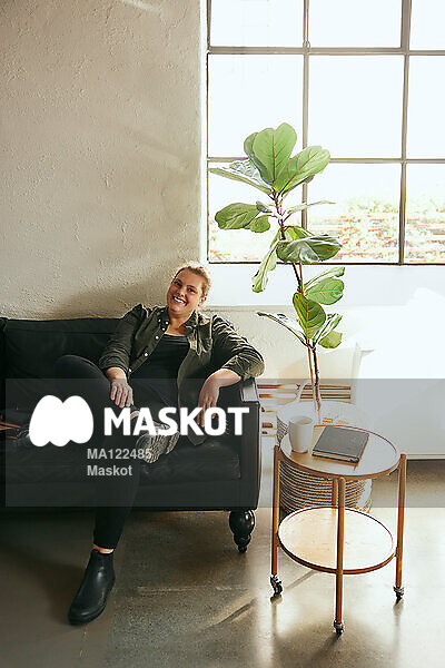 Porträtt av leende kvinnlig entreprenör som sitter i kontor