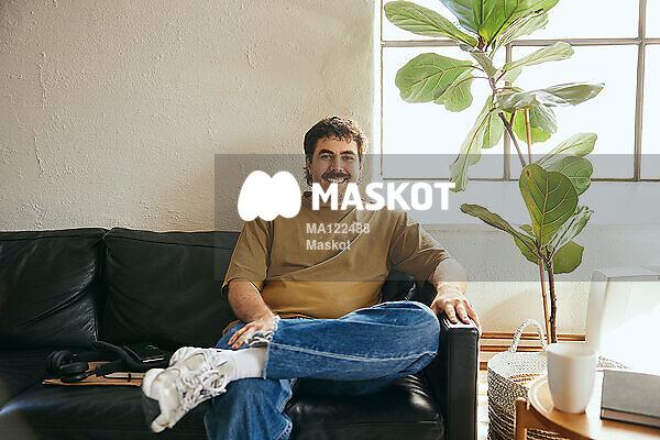 Porträtt av leende manlig entreprenör som sitter i soffa