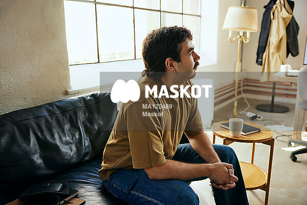 Manlig entreprenör sitter i soffa på kontor