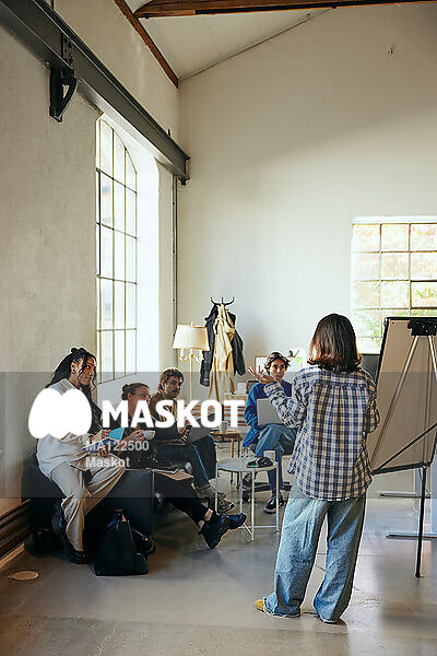 Ung kvinnlig entreprenör presenterar strategi för kollegor