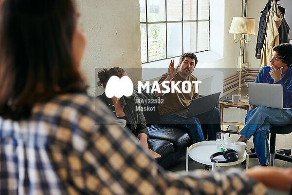 Manlig entreprenör räcker upp hand i möte