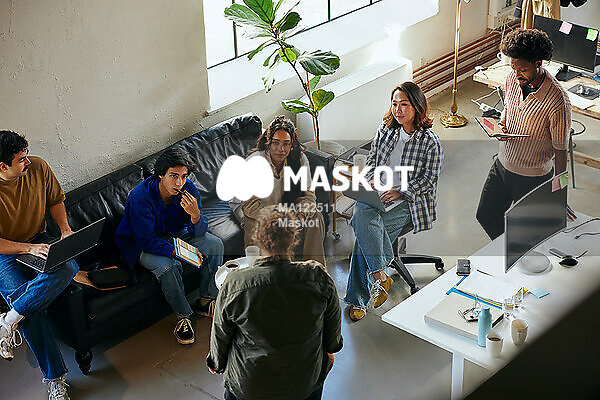 Manlig och kvinnliga entreprenörer har möte på kontor