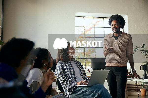 Manlig entreprenör diskuterar med kollegor