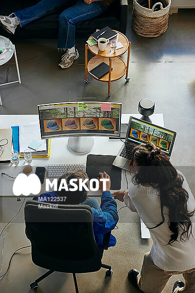 Manlig och kvinnlig entreprenör diskuterar vid dator på kontor