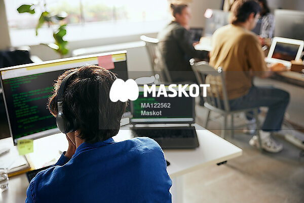 Manlig entreprenör med hörlurar kodar på dator