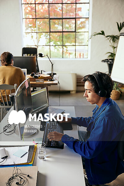 Manlig entreprenör med hörlurar arbetar på dator