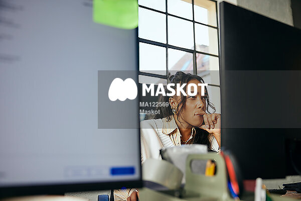 Fundersam kvinnlig entreprenör sitter på kontor