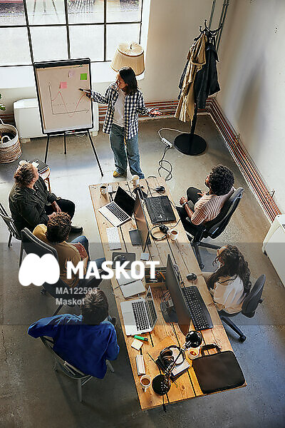 Kvinnlig entreprenör förklarar graf för kollegor