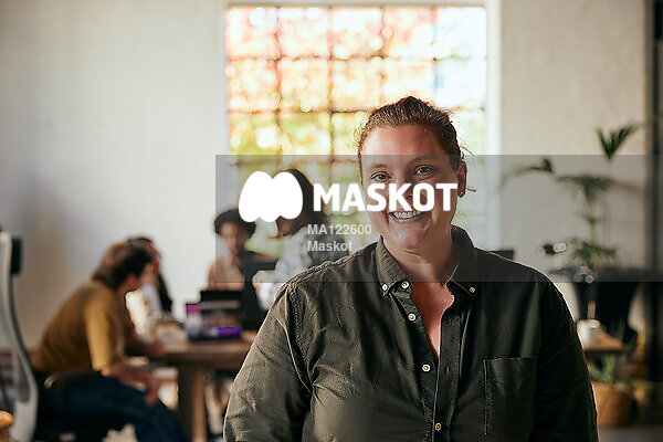 Porträtt av leende kvinnlig entreprenör som står på kontor