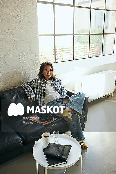 Porträtt av leende kvinnlig entreprenör som sitter i soffa på kontor