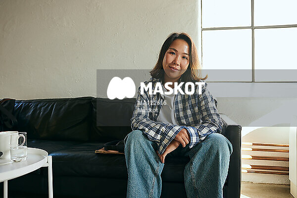 Porträtt av leende kvinnlig entreprenör som sitter i soffa
