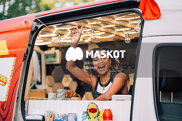 Glad ung kvinna vinkar från foodtruck