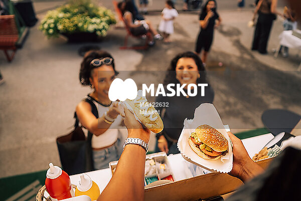 Man serverar unga kvinnor mat från foodtruck