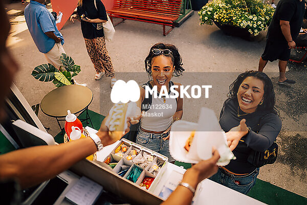 Glada unga kvinnor tar emot mat
