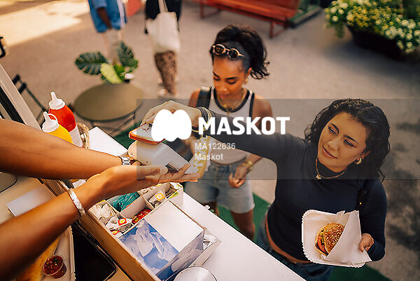 Ung kvinna betalar för mat med mobil