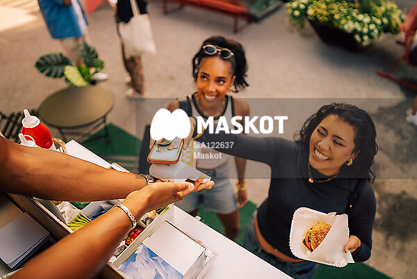 Glad ung kvinna betalar med mobil