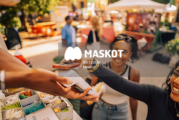 Ung kvinna betalar med mobil i kortterminal