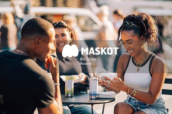 Glada vänner äter mat från foodtruck