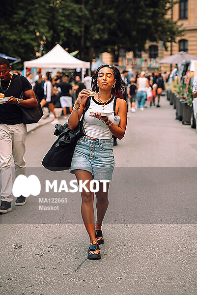 Ung kvinna njuter av mat på matfestival