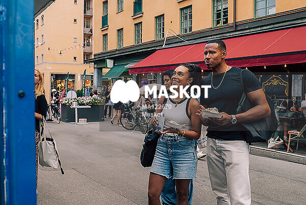 Vänner går runt på matmarknad
