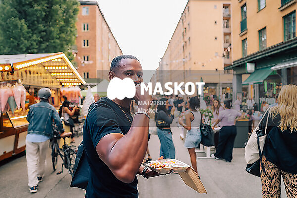 Porträtt av man gående mat mat på gata