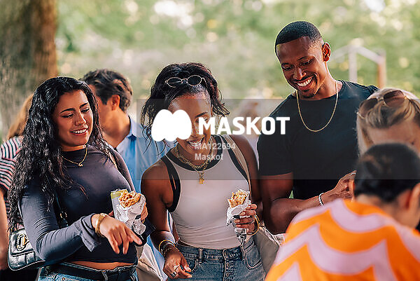 Glada vänner går runt på matfestival