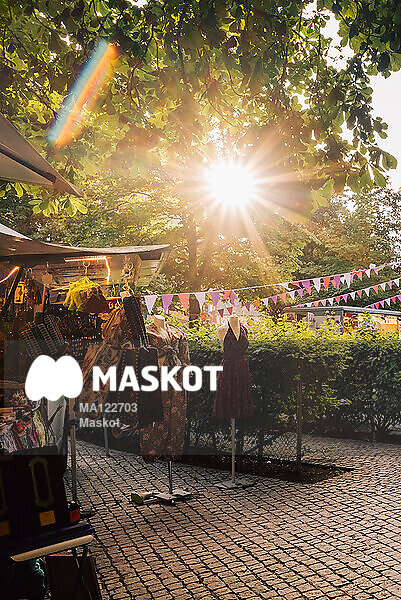 Kläder står utställda vid tält på marknad
